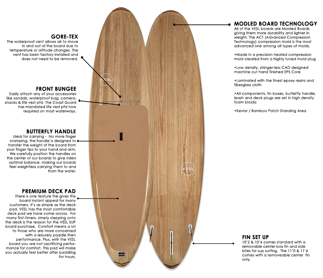 HEATED COMPRESSION MOLDED TECHNOLOGY: All of the VESL boards feature the most advanced compression molding technology. The superiority of molded boards is better strength and durability with lighter weight. The average board weight has been reduced by 2 to 3.5 lbs. Based on the different sizes the board strenght has been enhanced by 25-30%. The rails, nose and tail are reinforced and unidirectional kevlar / bamboo standing patch has also been added.